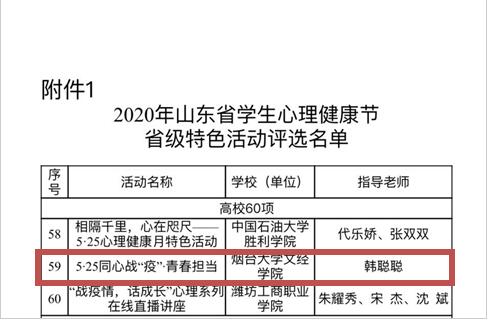 为深入学习贯彻习近平新时代中国特色社会主义思想,扎实做好新冠肺炎疫情防控下的心理健康教育工作,提升我省学校心理育人工作质量,山东省于2020年5月至6月组织举办学生心理健康节活动。烟台大学文经学院韩聪聪老师指导的特色活动和王晓黎老师发表的辅导案例获奖。