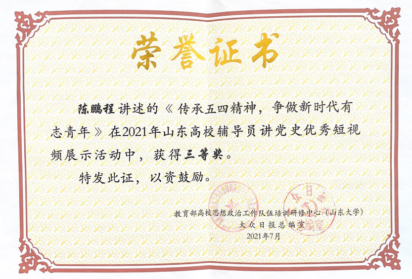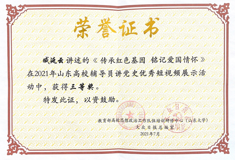 我校积极组织辅导员参加“山东高校辅导员讲党史优秀短视频展示”活动,其中建筑工程学院臧延云老师的《传承红色基因铭记爱国情怀》、人工智能学院陈鹏程老师的《传承五四精神,争做新时代有志青年》、机电工程学院李亮老师的《向海图强》均喜获省级三等奖。