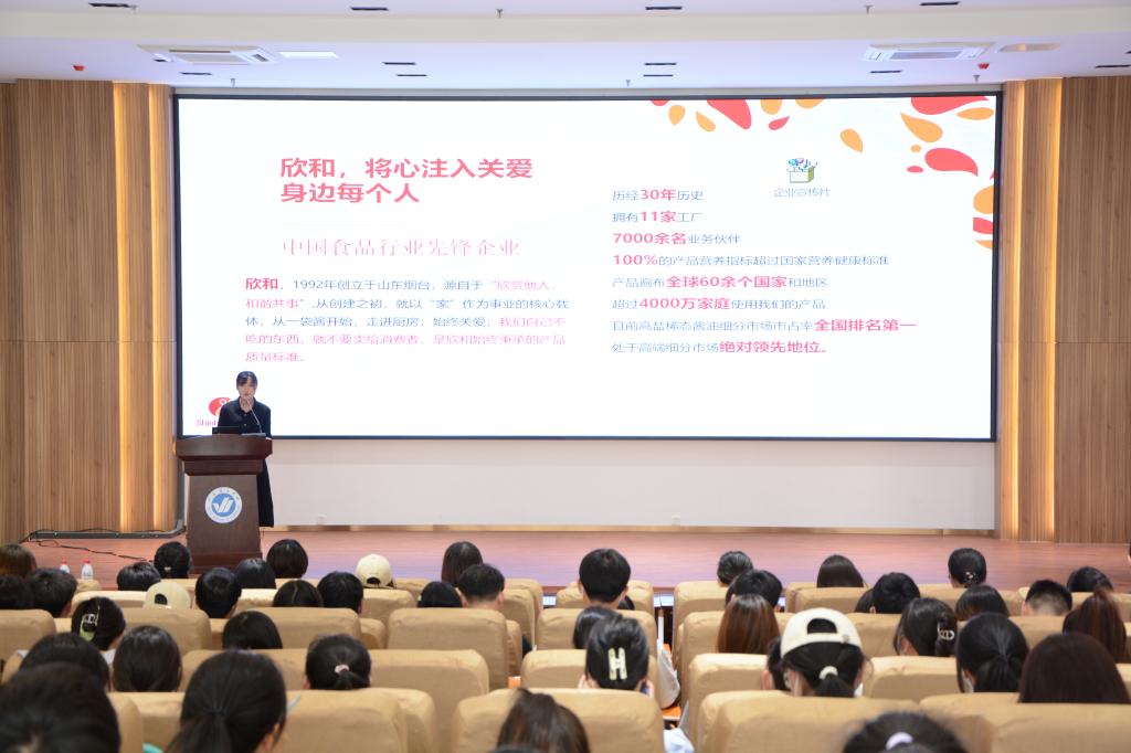 本次欣和企业“认识实习进校园”展示主要包括厨演车品尝和专家讲座两部分。厨演车美食品尝主要有酱油冰淇淋、醯官饮和有机蔬菜沙拉,并提供了多种欣和企业产品的展示。学生错时错峰有序参观展车及产品,进一步激发了同学们的学习兴趣与动力。专家讲座主要包括“欣和的故事”、“我们正在做的事情”以及“我们的事业发展”三个主题,使学生对所学专业建立感性认识,为进一步学习技术基础和专业课程奠定了良好基础。