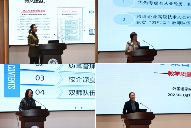 七个一级指标排名第一位的四个学院先后做了经验分享。食品与生物工程学院副院长姜倩倩从立足服务地区经济发展出发,搭建产学研平台,实现科研成果转化,开展应用型特色人才培养。会计与金融学院副院长朱淑梅从构建应用“四融合”的实践教学模式与策划组织“立信杯”会计技能评比大赛两个方面阐述该学院的办学特色,通过融合实践教学与竞技比赛,锻炼了学生的专业技能,并将会计与金融学院的实践教学先进模式推广到国内其他学校。机电工程学院副院长刘安琴通过建章立制、强化过程、注重积累、分类归档的角度分享了教学管理规范化建设的经验,特别是在实验室规范建设方面。外国语学院副院长于巧丽介绍教学质量提升的关键在于将德育与专业教学有机融合,通过提升教师能力与素养,从而保障外国语学院的教学质量。