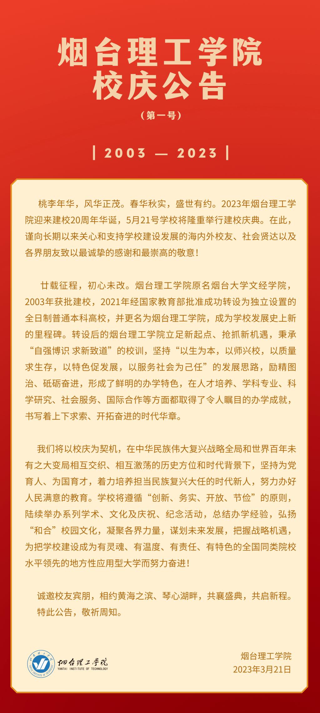 烟台理工学院校庆公告(第一号)