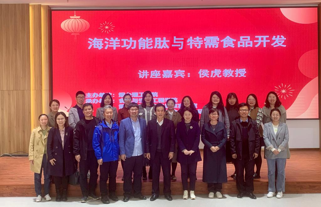 活动邀请了中国海洋大学博士生导师、山东省泰山学者、黄海明珠领军人才、Purdue University访问学者、国家实验室研究员、青岛技术创新中心主任侯虎教授作学术报告。山东海洋资源与环境研究院研究员,烟台大学、鲁东大学、滨州医学院、山东商务职业学院教师代表,山东国和堂制药有限公司、烟台拉斐尔生物科技有限公司企业代表,食品学院师生代表参加此次活动。