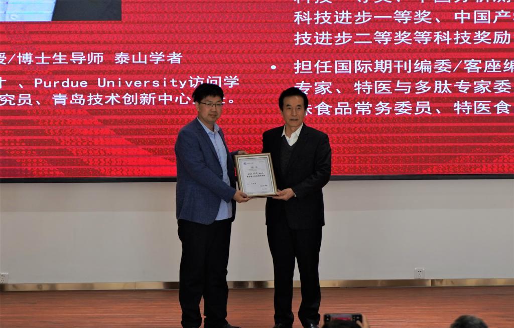 食品与生物工程学院院长金海珠教授致开幕词,对侯虎教授以及各位专家的到来表示热烈欢迎,他指出,此次活动目的是加强学术交流,打造联盟共同体,把握科技方向,争做行业一流。接下来,金院长为侯虎教授颁发了烟台理工学院兼职教授聘任证书。