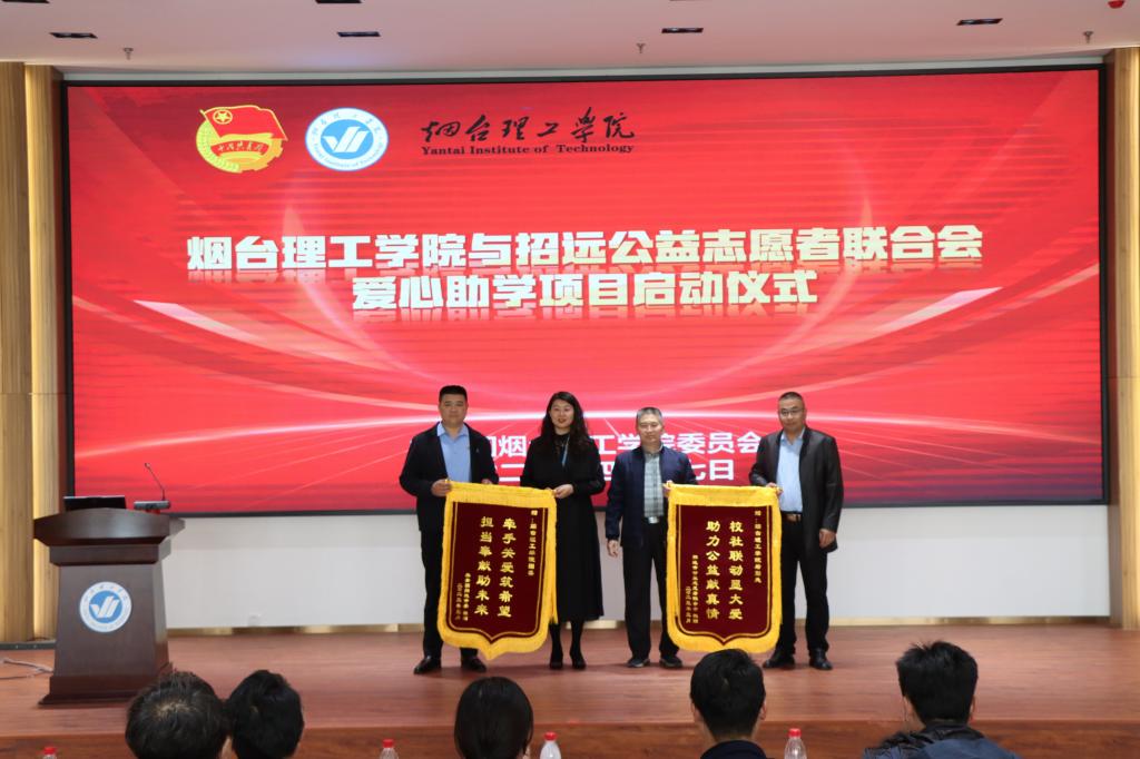启动仪式上,校长助理杜娟与招远公益志愿者联合会会长冯晓伟共同为爱心助学项目揭牌,共青团招远市委及招远市公益志愿者联合会为烟台理工学院赠送锦旗。