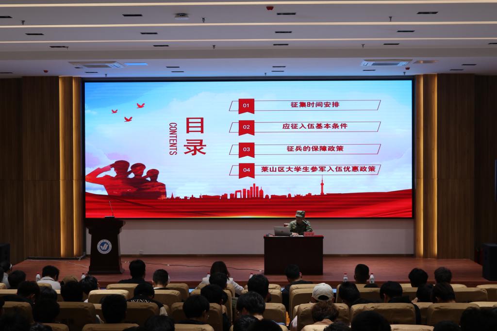 为宣传贯彻党的二十大精神,扎实做好我校国防教育及征兵宣传工作,激发大学生积极投身于国防建设的参军热情,鼓励应届毕业生以及在校生应征入伍服务国防建设。4月19日我校举办了“新征程上的大学生应向雷锋学什么主题授课暨征兵政策宣讲会”本次宣讲会邀请北部战区陆军第80集团军政治工作部原大校副主任毕可弟教授担任主讲,莱山区人武部上校政治委员李宁政委、莱山区征兵办王磊科长出席,各学院团总支书记、副书记,相关负责老师及学生代表聆听报告。