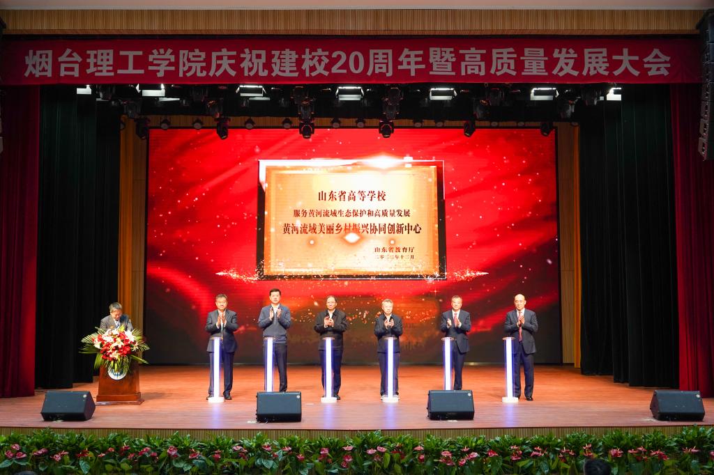 会上,各位领导、嘉宾依次上台为学校获批的山东省高校黄河流域美丽乡村振兴协同创新中心、烟台市特医食品重点实验室,筹建成立的烟台理工学院健康学院(筹)、烟台理工学院数字媒体产业学院揭牌。