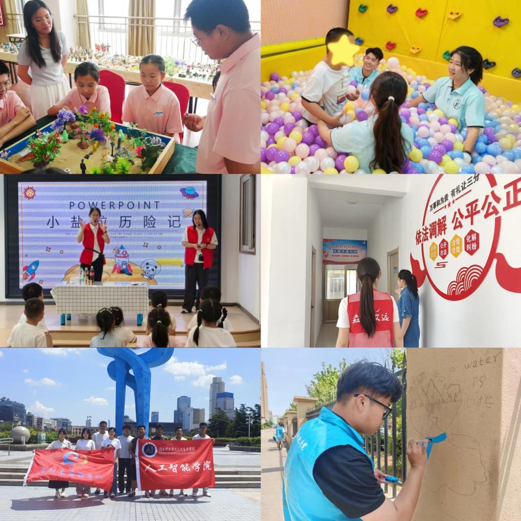 校团委“青春正当时”服务队联合招远市公益志愿者联合会,举办“润心伴成长 同心护未来”夏令营,带领心理困境儿童走进消防大队学习安全知识、赴济南研学感受文化魅力,通过一对一补习、心理沙盘游戏等,搭建成长桥梁。信息工程学院“星火暖源”服务队赴济南晓爱儿童康复中心,发挥信息专业优势,设计无人机演示、模型组装、编程小游戏等课程,耐心陪伴心智障碍儿童,结合日常康复辅助撰写服务心得,以专业赋能成长。食品与生物工程学院“微尘志愿服务队”走进山东省烟台市莱山区万光府前社区,进行“化学奇趣探险营,变身科学魔法师”“绘趣启蒙童心,悦读点亮童智”“铭记血色丰碑,共筑家国同心”“活字传韵承古,翻花绽彩焕新”等七彩假期志愿服务。文法学院实践队走访烟台莱山区人民法院、烟台仲裁委、芝罘区警保联控站、安联保险公司等法律机构,聚焦研究“矛盾纠纷多元化解”,提出优化矛盾调解机制的可行建议。人工智能学院“启航”志愿服务队先后赴济南大明湖护城河、泉城广场、解放阁三地,通过水质检测、民意收集等多样化形式开展生态环保服务。经济管理学院“生态润心”志愿服务队以墙绘为媒,将“节水环保”理念直观化、生动化,让生态理念更贴近居民生活。“进社区”主题系列活动彰显了大学生的责任担当,用热忱与专业为不同群体送去关爱与助力。