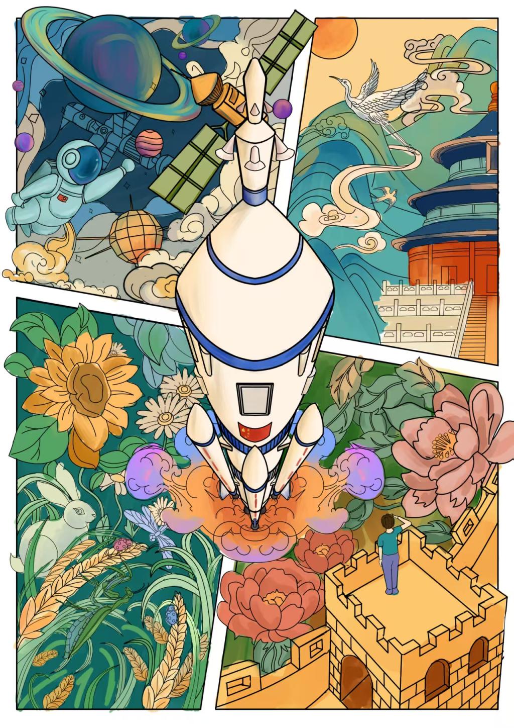 在红色插画主题单元,安平、张涵老师指导的数字媒体艺术专业建2306-1班学生张关宏作品《我与天坛》、石志南作品《星火长征》荣获一等奖;孙嘉懿《革命征程印象》、钟真《新欣向荣》、张瀚升《薪火相传》分获二等奖。这些作品主题鲜明、构思新颖,既体现出扎实的专业基础,也展现了青年一代对红色文化的深刻理解与艺术表达。
