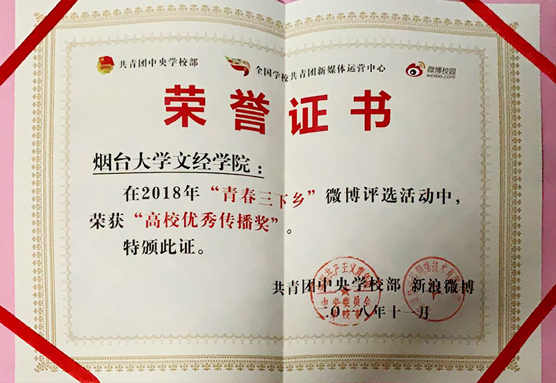 2018年12月下旬,共青团中央学校部、全国学校共青团新媒体运营中心、微博校园对2018年全国高校志愿者暑期社会实践“青春三下乡”微博优秀成果遴选活动结果进行公布。我院获高校优秀传播奖,琴心实践队、梦想起航实践队获优秀短视频奖,学生马奔获优秀运营编辑奖。