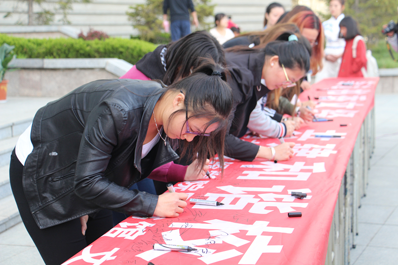 文法141-2班邢鸿波同学作为学生代表发言。文法系学生会干部田慧宣读读书倡议书,倡导文经学子多读书,读好书,以书为友,以书为鉴,不断充实完善自我。师生共同在“营造书香校园,共建和谐文经”条幅上签字。
