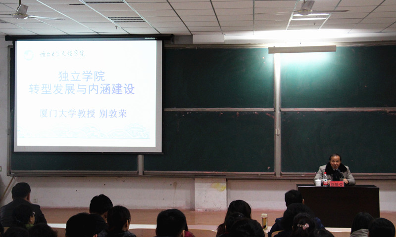 别敦荣教授针对独立学院发展现状和我院实际,从国家政策导向、独立院校现状和高等教育内涵发展三个方面进行讲解。他指出,在国家高等院校向应用型大学转型的大背景下,独立学院要逐渐走出一条具有自己特色、不同于母体院校的路子,才能实现长足发展,实质意义的转型至关重要。