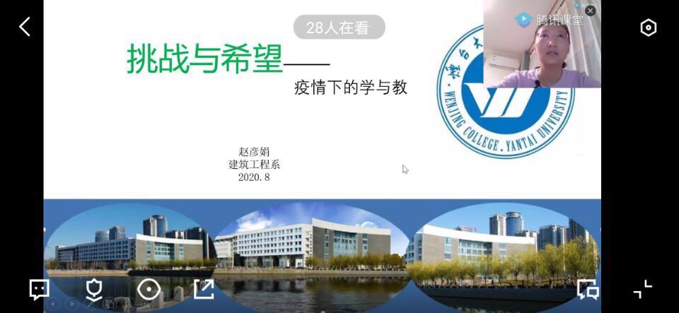 暑假期间,建筑工程系教工党支部组织全系教师使用腾讯课堂以“屏幕分享+语音+视频”的形式进行了三次线上课程经验分享交流,此次交流会是“疫情下在线课程建设”活动之一,是基于一学期线上教学工作的总结,为全系教师提供经验交流的平台。三次交流会分别有(杨杰、刘莹、李翠玲、赵彥娟、刘彬、王虹霖、潘萌、张檬元、杨纪婷、邹金益、王伟萍等)11位教师对过去一学期在线课程的建设方法与心得进行了分享。