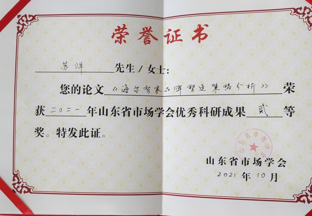 山东省市场学会第七届会员代表大会暨第八届营销创新高峰论坛于10月下旬在山东济南举行。大会由山东省市场学会主办,华典知识产权服务集团承办。本次大会完成学会换届选举,经管学院郭承鑫老师当选学会理事,苏洋老师当选学会副秘书长、常务理事。苏洋老师的论文《海尔智家生态品牌建设策略研究》获得2021年山东省市场学会优秀科研成果二等奖。