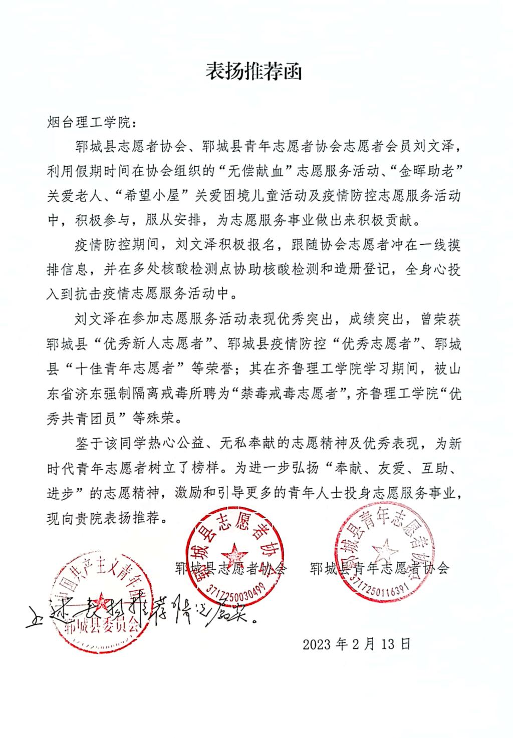 表扬信中写道,刘文泽责任心强,服从安排,为志愿服务事业做出积极贡献,荣获“郓城县优秀新人志愿者”、郓城县疫情防控“优秀志愿者”、郓城县“十佳青年志愿者”等荣誉;曾被山东省济东强制隔离戒毒所聘为“禁毒戒毒志愿者”。